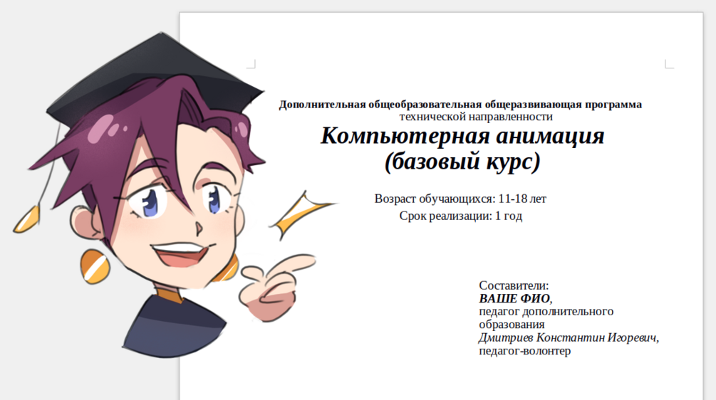 Дополнительная образовательная программа «Компьютерная анимация» является авторской общеразвивающей программой по художественному и техническому направлениям. Программа рассчитана на разновозрастный контингент обучающихся от 11 до 18 лет, но может быть применена и для более взрослой аудитории.
